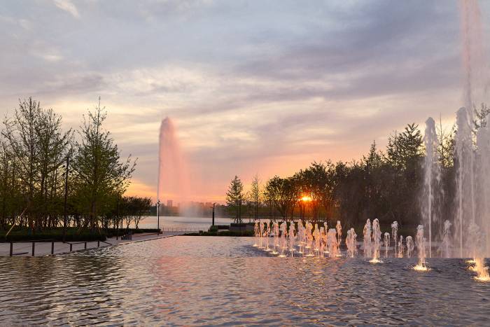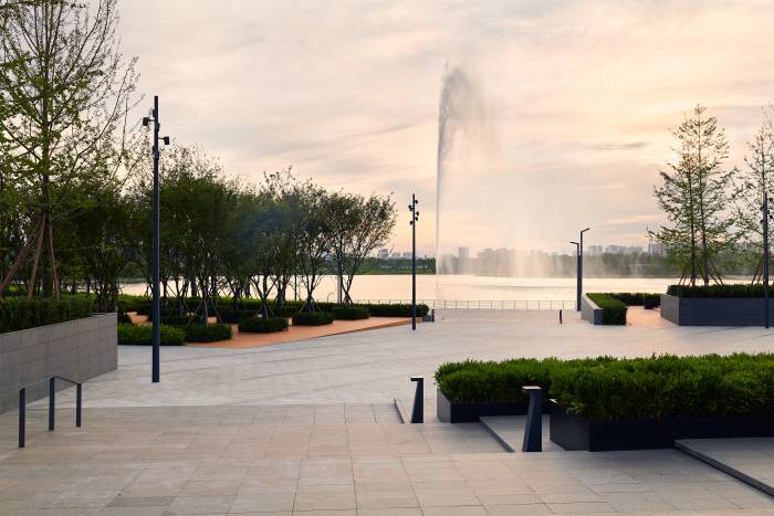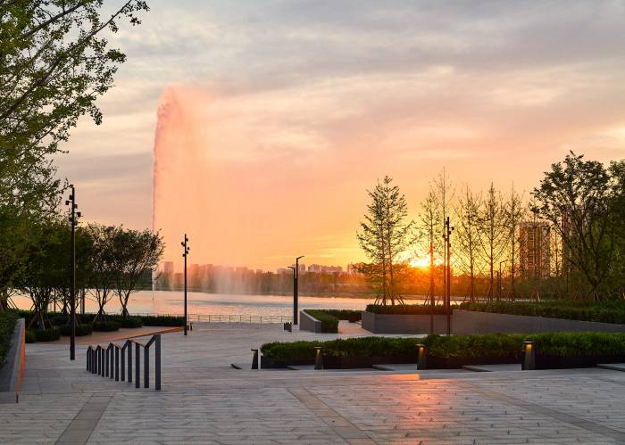 黑色花岗岩打造的叠水景,水体沿阶面层层而下,呈现出级级跌落的形态。极具现代主义的怡心湖公园,漫天的银杏树,以“展示时间变换的盒子”为设计概念,使银杏广场展现出四季更迭,一季风景,一季回忆的光阴之美。风光绮丽的环湖步行绿道,美妙绝伦的百米湖心喷泉,波光潋滟的广阔湖面,勾勒出一幅独特的浪漫画卷。